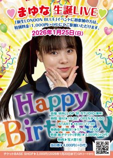 まゆな生誕ライブ 🎂 📅 2026年1月25日(日) 📍 WALLOP 3F STUDIO 🕓 受付15:30/OPEN 15:50/START 16:00〜17:00 📸 特典会:2F(17:10〜18:00) 🎫 チケット ・3,000円(+D代)✨写メ券1枚付 ・1,000円(+D代)👉 初来場特別チケット